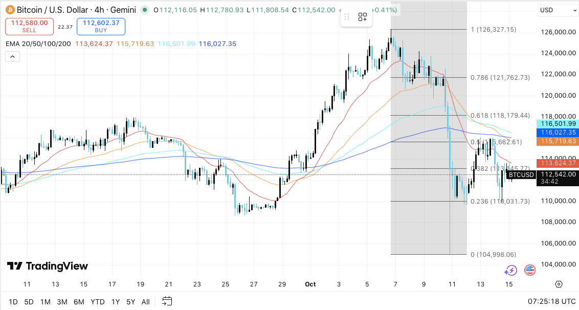 Это движение в пределах диапазона последовало за сильным ростом в начале октября и теперь отражает равновесие между покупателями и продавцами. Трейдеры внимательно следят за зоной поддержки на уровне $110,000, которая остаётся ключевой линией защиты от более глубоких коррекций.