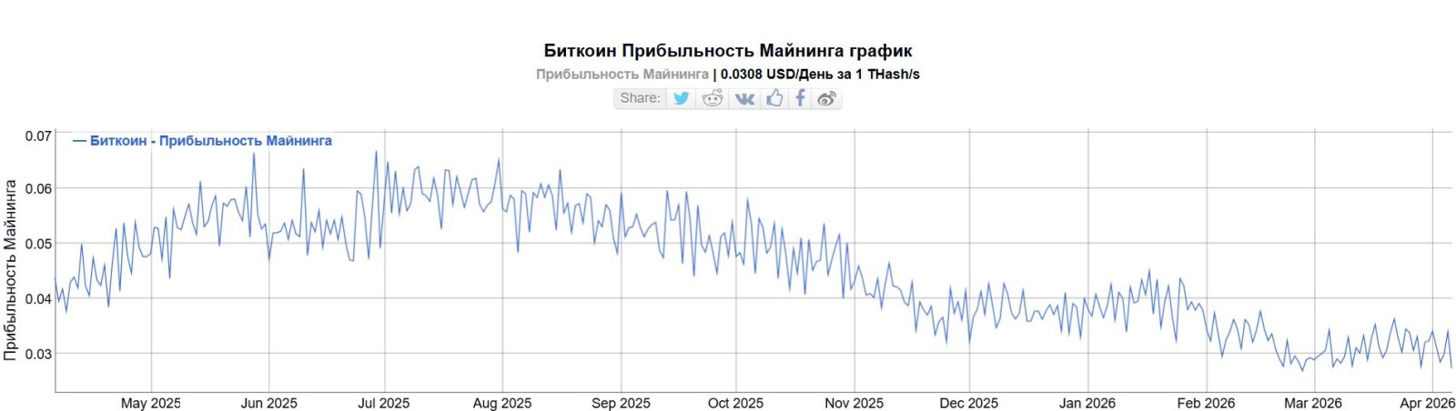 График прибыльности майнинга биткоина. Источник: BitInfoCharts