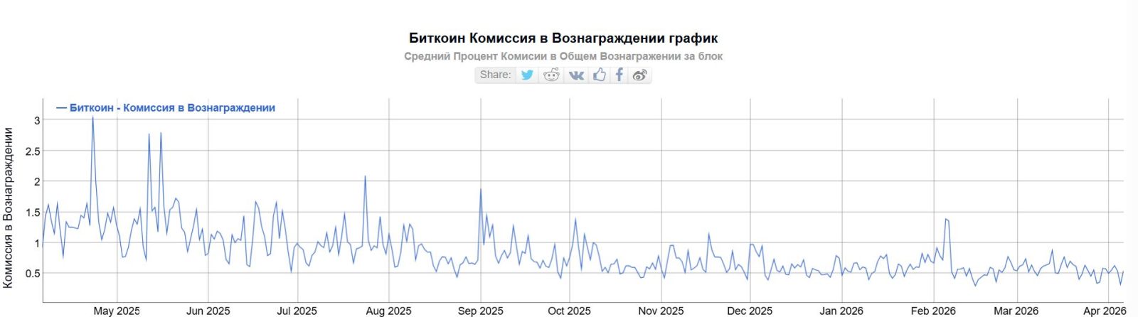 Однако доля комиссий в вознаграждении майнеров неуклонно снижается. Год назад в среднем она составляла около 1-1,5%, а в этом апреле — 0,3-0,6%.