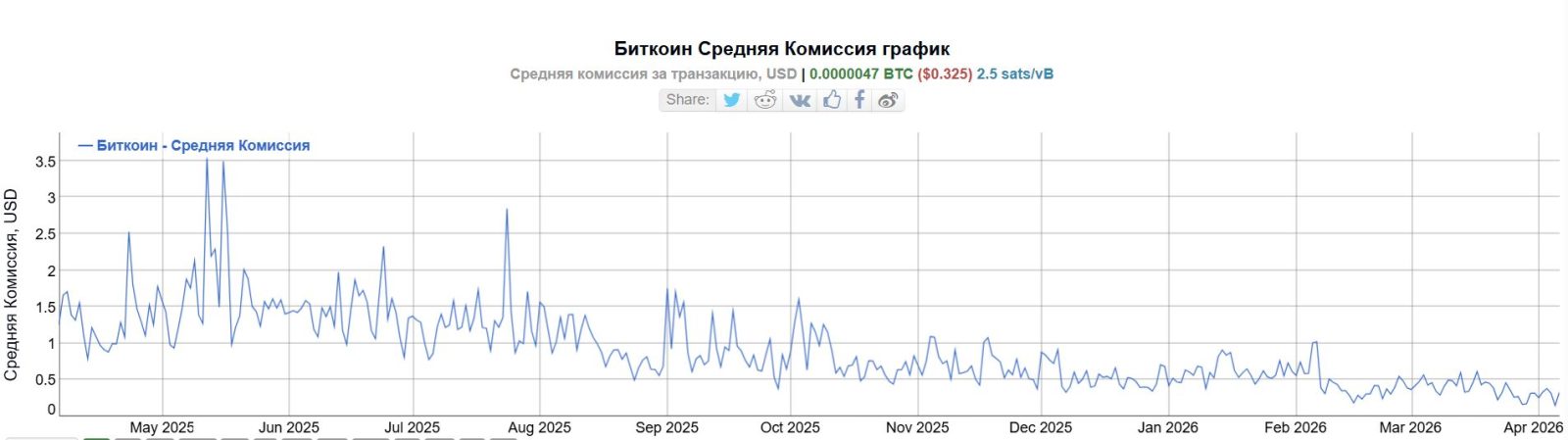 Снижение сетевой активности оказало негативное влияние на экономику майнинга. Средняя комиссия за транзакцию в сети биткоина с февраля не поднималась выше $1, а 5 апреля обвалилась до рекордного минимума в $0,149. По данным на 7 апреля, в среднем комиссия составляют $0,325.