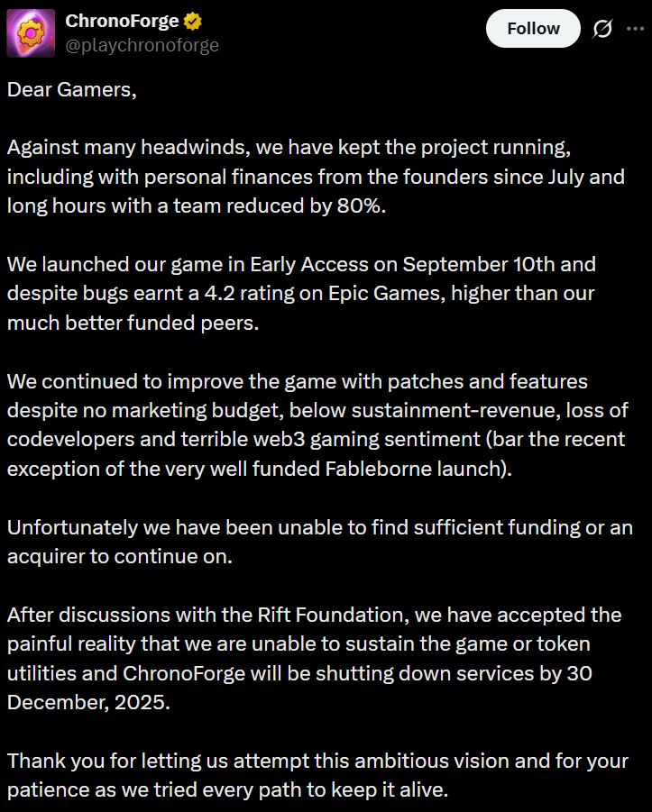 ChronoForge, a Web3 game studio developing a multiplayer action RPG centered on onchain asset ownership, is shutting down after months of operating with a drastically reduced team, a closure that underscores the severe financial pressures facing the Web3 gaming sector during the current market downturn.