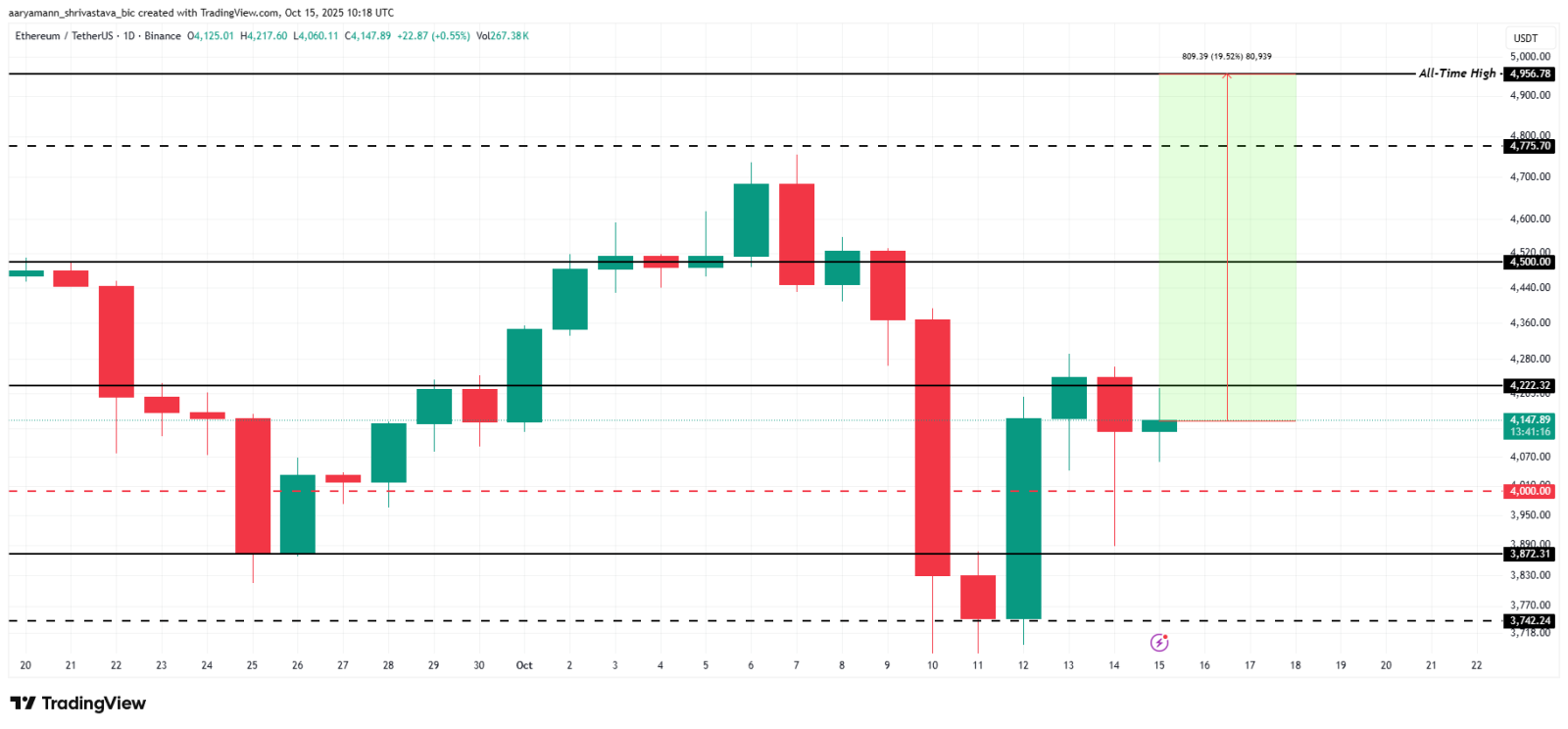 Ethereum сейчас находится в районе $4 147, торгуясь чуть ниже ключевого уровня сопротивления в $4 222. Успешный прорыв этого барьера может поднять ETH к $4 500, что привлечет больше инвестиций как от институциональных, так и от розничных инвесторов.