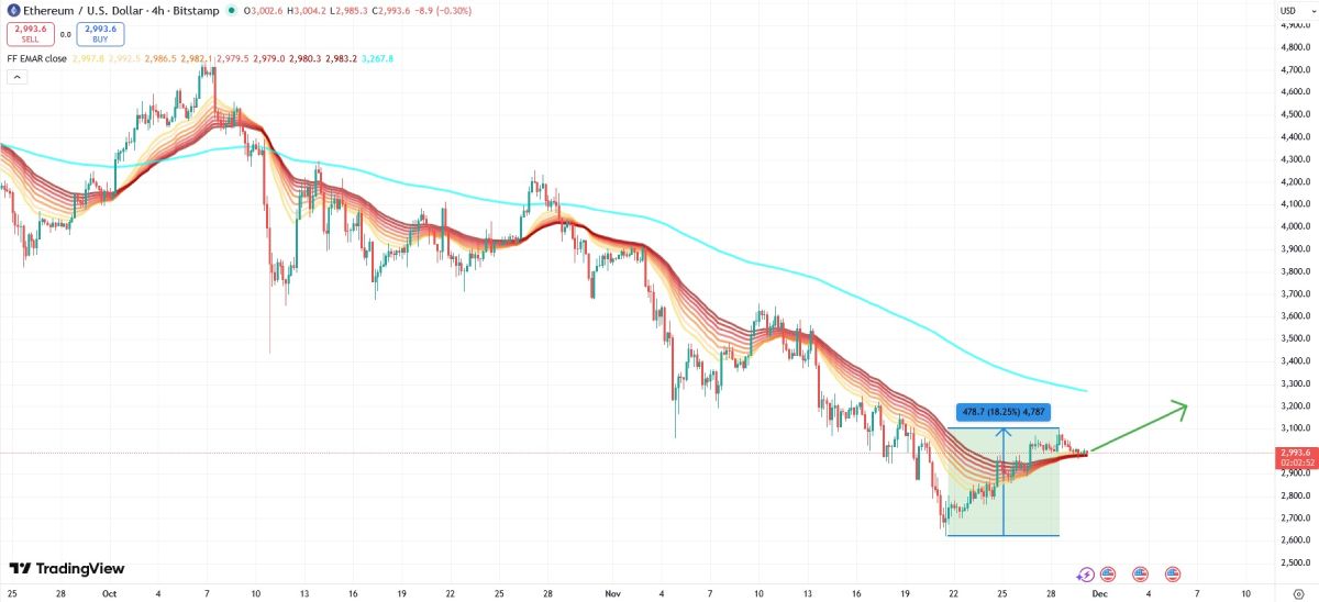 В рамках коррекции цена ETH повысилась на 18% и ненадолго удержалась над барьером $3,000. Но, как полагает Максим, восходящее движение продолжится, поэтому курс эфириума вырастет на 7% от текущего значения и достигнет $3,200 перед следующей волной медвежьего тренда. Однако, учитывая риски, имеет смысл дождаться окончания нисходящей тенденции и купить монеты на локальном дне вместо того, чтобы приобретать их сейчас с надеждой на 7% рост цены.