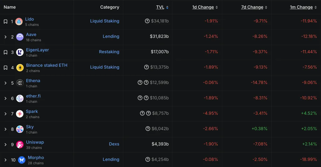 Топ-10 крупнейших DeFi-проектов на Ethereum. Источник: DeFi Llama.