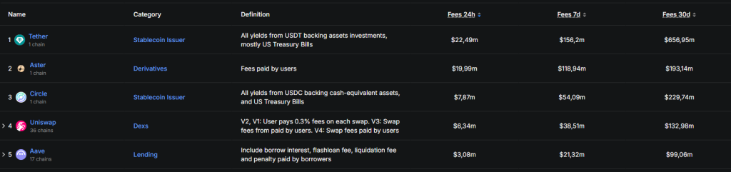 Платформа также заняла верхние строчки в рейтинге протоколов по объему комиссий. 28 сентября показатель Aster превысил $29 млн против $22 млн и $7 млн у Tether и Circle соответственно.