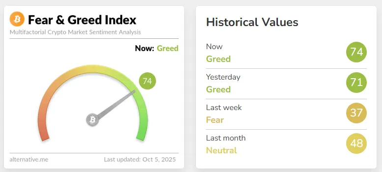 Криптовалютный индекс страха и жадности достиг 74, хотя на прошлой неделе находился на 34.
