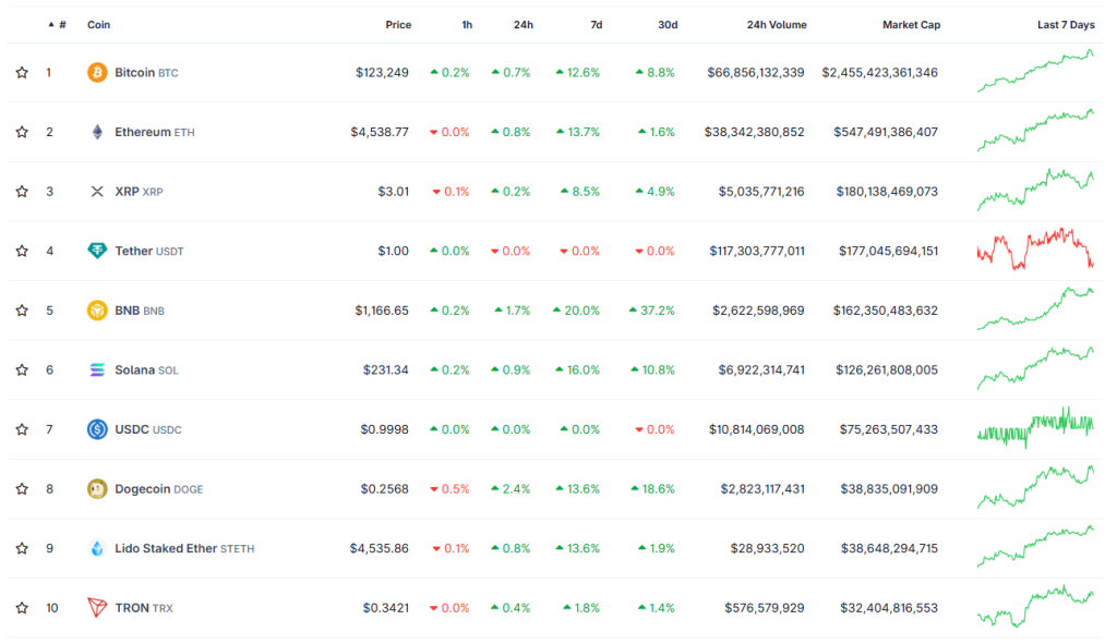 На момент написания монета скорректировалась до $123 300, капитализация составляет $2,45 трлн. За прошедшие семь дней биткоин вырос на 13%.