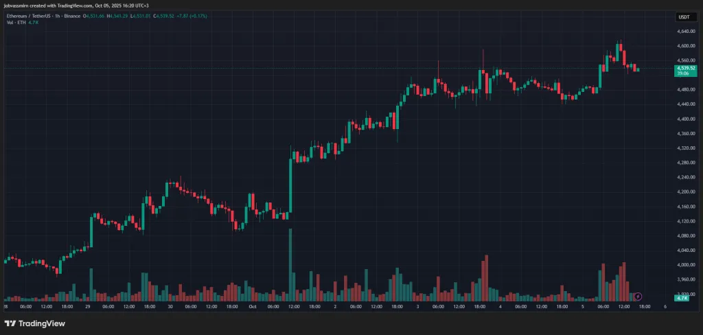 За семь дней курс ETH увеличился на 13,7%, протестировав $4600. Сейчас цена упала к $4500, до обновления ATH остается около 8%.