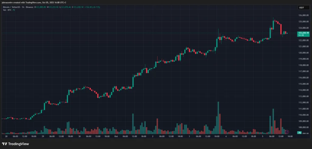 Всю неделю биткоин демонстрировал позитивную динамику с небольшими перерывами на консолидацию. Утром 5 октября цифровое золото все же обновило свой исторический максимум (ATH) на уровне $125 708.