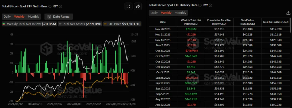 На восстановление веры инвесторов также указывают возобновившиеся притоки в ETF. Согласно SoSoValue, с понедельника по пятницу в спотовые биткоин-фонды поступило $70 млн. Это прервало четырехнедельную серию оттоков.