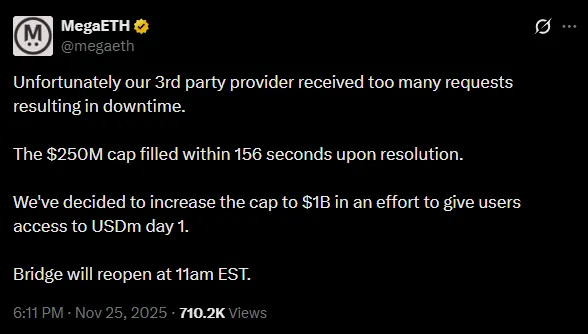 25 ноября MegaETH планировал собрать ликвидность перед запуском основной сети в декабре. Условия были следующими: старт в 9:00 утра (ET), лимит в $250 млн, принцип «первым пришел — первым обслужен» и KYC через платформу Sonar.