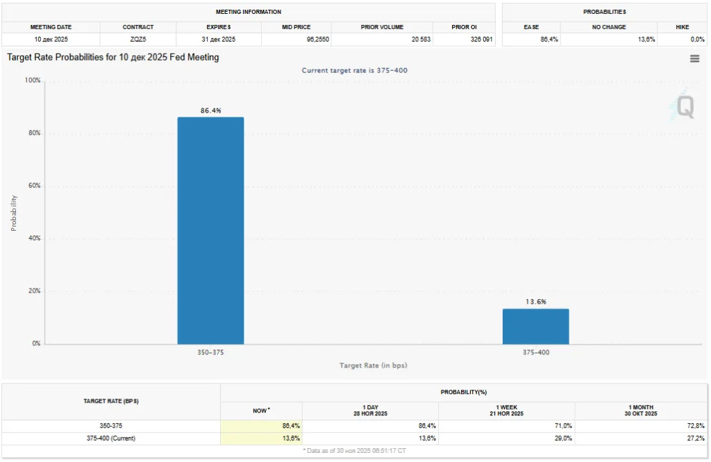 Дополнительный импульс придают ожидания снижения ключевой ставки ФРС в декабре. Участники рынка оценивают вероятность смягчения монетарной политики в следующем месяце в 86,4%.