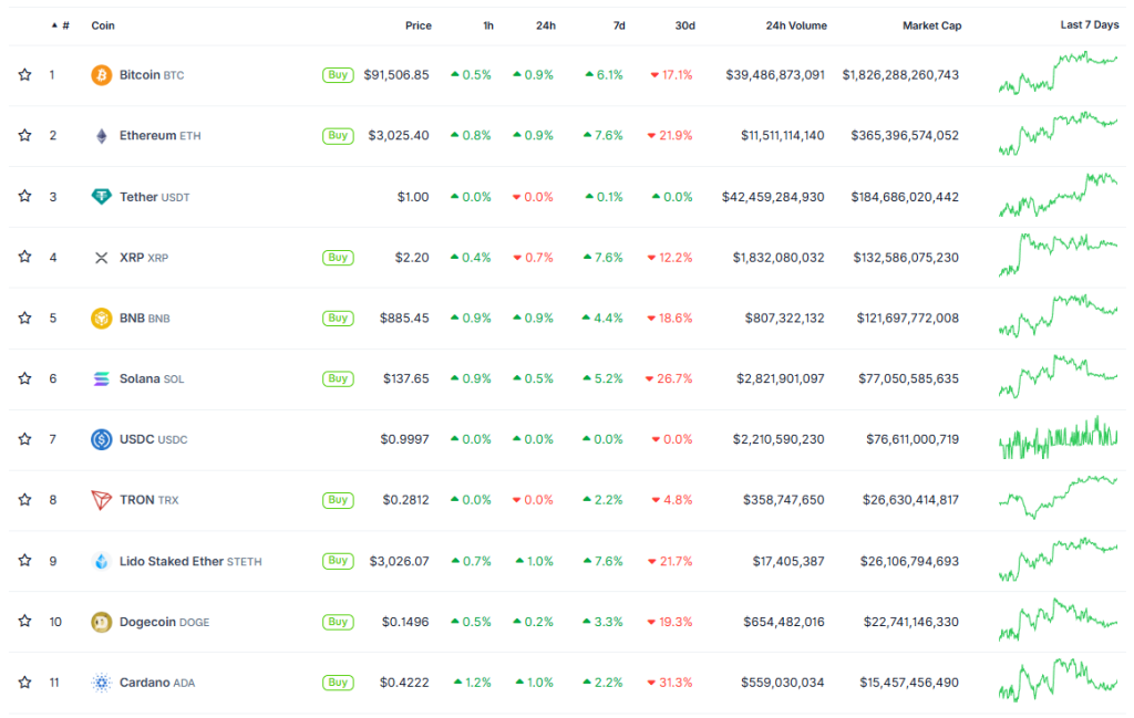 На момент написания биткоин торгуется на уровне $91 500, за неделю прибавив почти 6%.