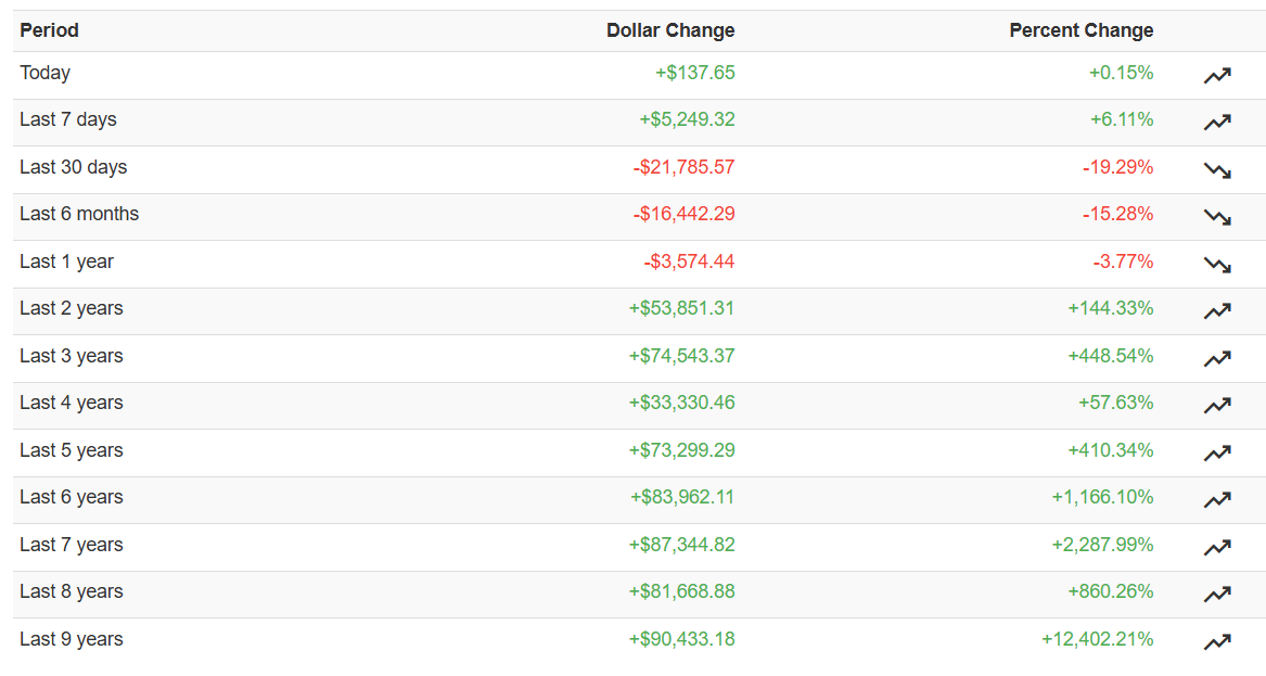 Как менялась цена биткоина за последние 9 лет. Источник: coin.dance
