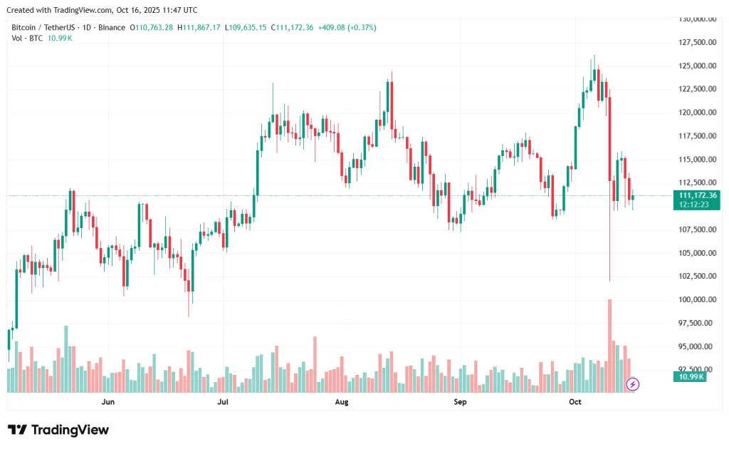 В моменте котировки первой криптовалюты снижались до ~$109 800. На момент написания цена восстановилась до $111 220. Коррекция последовала за крупнейшей в истории крипторынка ликвидацией позиций на сумму свыше $19 млрд за прошлые выходные.