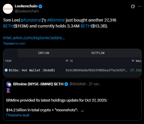Транзакция с адреса кошелька «0xDc8…3a07f» включала в себя примерно 27,316 ETH. А значит, BitMine продолжает агрессивную стратегию накопления.