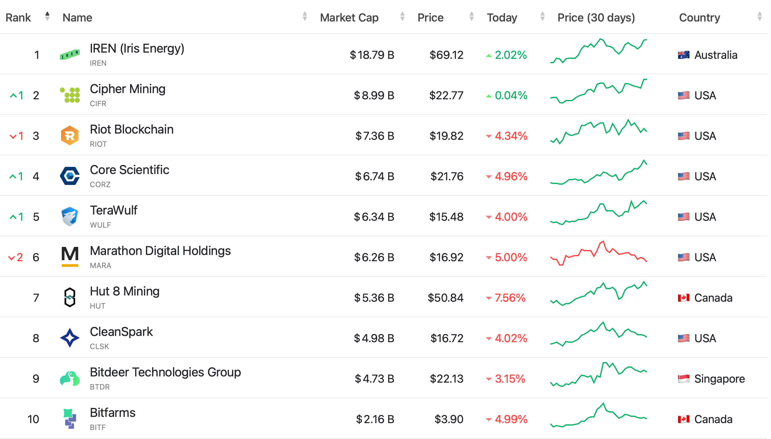 Топ-10 майнеров биткоина по рыночной капитализации. Источник: CompaniesMarketCap