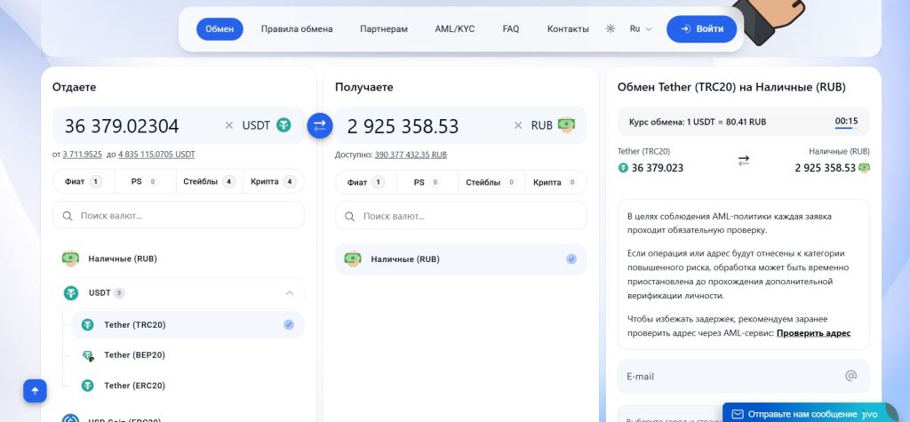 Особенностью сервиса является использование курса в реальном времени. Если во время оформления заявки курс изменяется более чем на небольшой процент, система автоматически пересчитывает сумму, чтобы пользователь получил максимально точный результат.