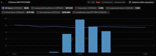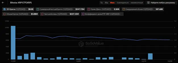 За этот же период приток денежных средств в фонд оказался равен $247,72 млн. Больше среди спотовых ETF на XRP по состоянию на конец декабря показал только Canary XRP ETF. Стоит отметить, что последний был допущен на шесть дней раньше, чем Bitwise XRP ETF.