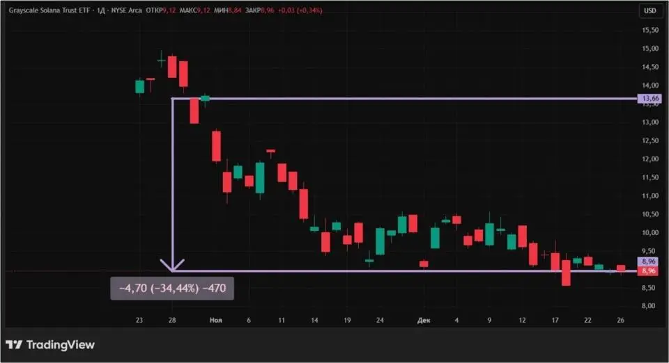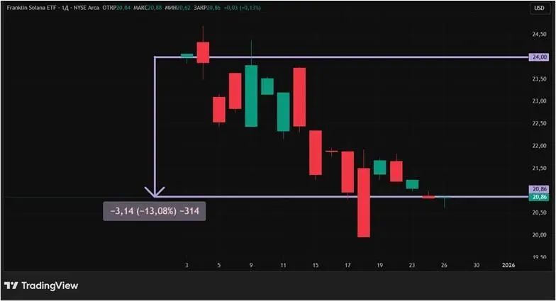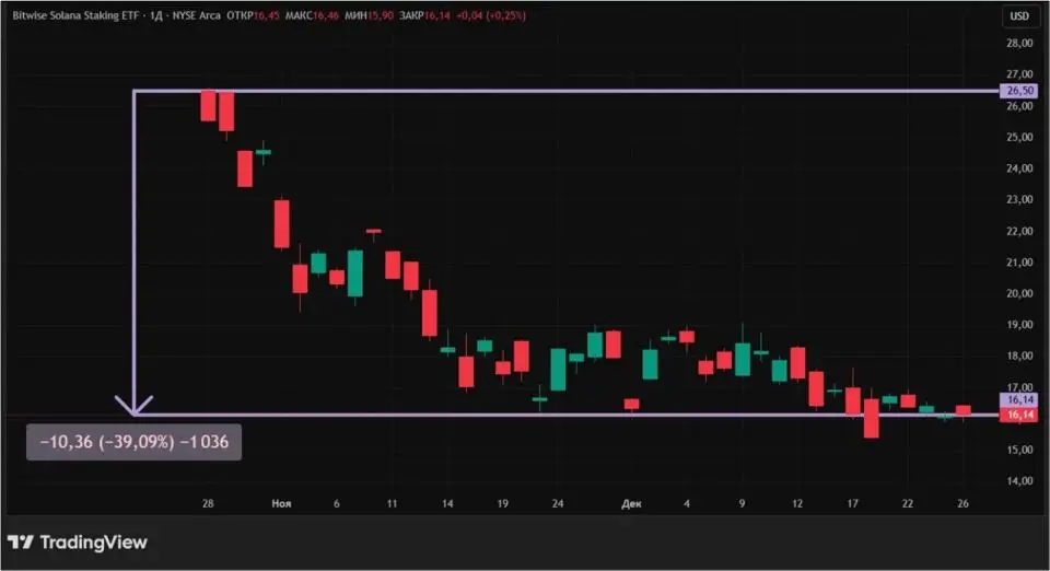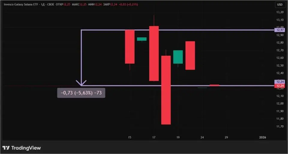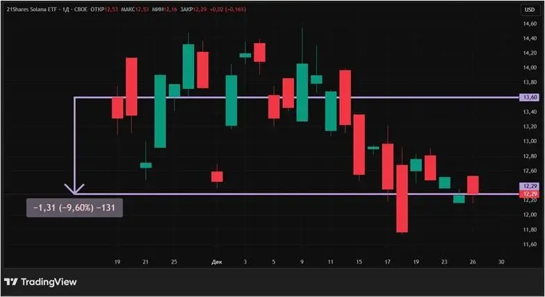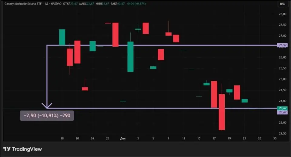 Акции спотового биржевого фонда на Solana от Canary Capital были допущены к торгам 17 ноября 2025 года. За полтора месяца нахождения свободном обращении ценные бумаги SOLC потеряли 10,91%, снизившись с $26,57 до $23,67.