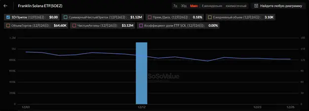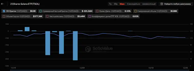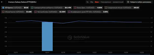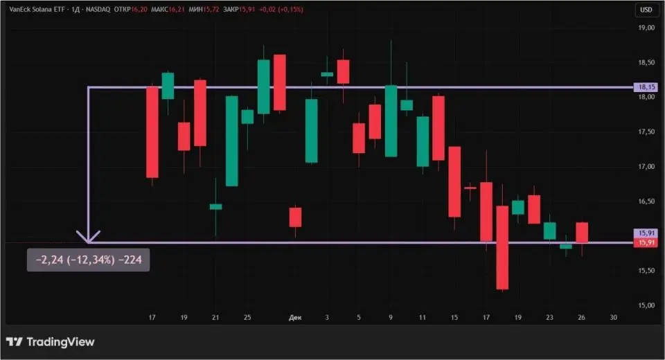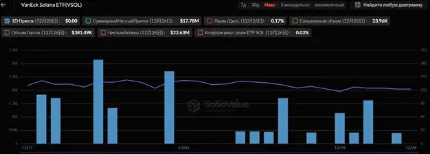 Стоит отметить, что с октября по декабрь 2025 года у VanEck Solana ETF не было ни одного дня, когда инвесторы предпочли бы выводить деньги из фонда. С октября по декабрь 2025 года у VanEck Solana ETF не было ни одного дня, когда инвесторы предпочли бы выводить деньги из фонда. Хотя, и приток денежных средств был достаточно скромен — $17,78 млн.