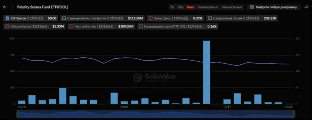 Если акции спотового ETF на Solana от Fidelity падают, то в отношении денежных потоков ситуация иная. Фонд демонстрирует хоть и небольшой, но стабильный приток средств, который кумулятивно к концу декабря достиг $112,5 млн. Оттоком денег до сих пор не была отмечена ни одна торговая сессия для FSOL.