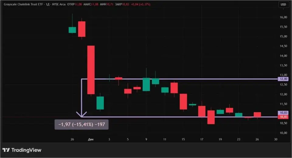 Grayscale Chainlink Trust начал торговаться на бирже 2 декабря 2025 года. На фоне снижавшегося крипторынка, акции фонда также не показали положительной динамики в последний месяц года — их падение составило 15,41%.