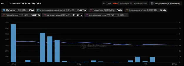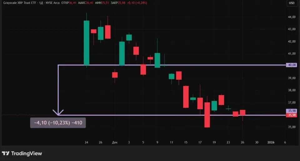 Торги Grayscale XRP Trust ETF начались 24 ноября 2025 года. В первый день акции фонда прибавили более 9%, однако далее наступила коррекция. К концу декабря 2025 года ценные бумаги GXRP снизились на 10,23%.