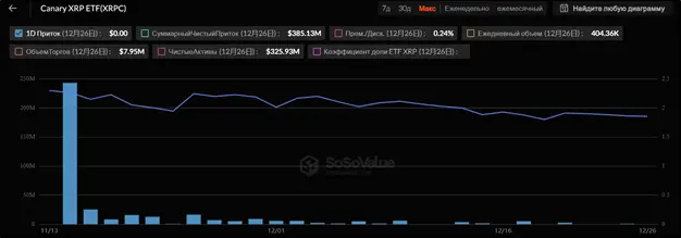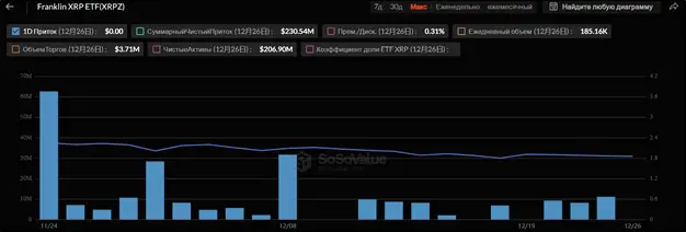 С 24 ноября XRPZ стабильно наращивал кумулятивный денежный приток — к концу декабря он оценивается в $230,54 млн. Ни в одну торговую сессию Franklin XRP ETF не испытал оттока средств и лишь в пяти случаях активность инвесторов была нулевой.