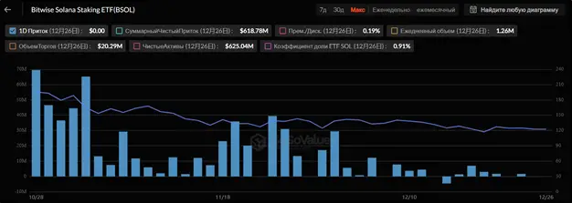 За два с лишним месяца спотовый ETF на SOL от Bitwise показал лучшие результаты среди всех фондов этой категории по размеру денежного притока. BSOL смог привлечь средства инвесторов на сумму $618,78 млн. Отток денежных средств из фонда состоялся только в один день — 15 декабря — и составил $4,59 млн.