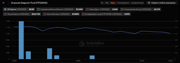 Более чем за месяц спотовый фонд на DOGE от Grayscale зафиксировал всего пять случаев притока средств на сумму $3,03 млн. Оттока денег инвесторов ни в одну торговую сессию до сих пор не наблюдалось.