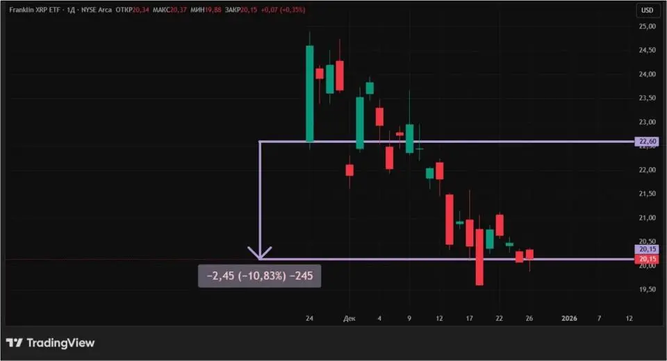 Акции XRPZ начали торговаться с 24 ноября 2025 года. В первый день они сразу прибавили 8,9%, однако дальнейшего роста не произошло. В следующий месяц акции спотового ETF на XRP от Franklin Templeton потеряли 10,83%.