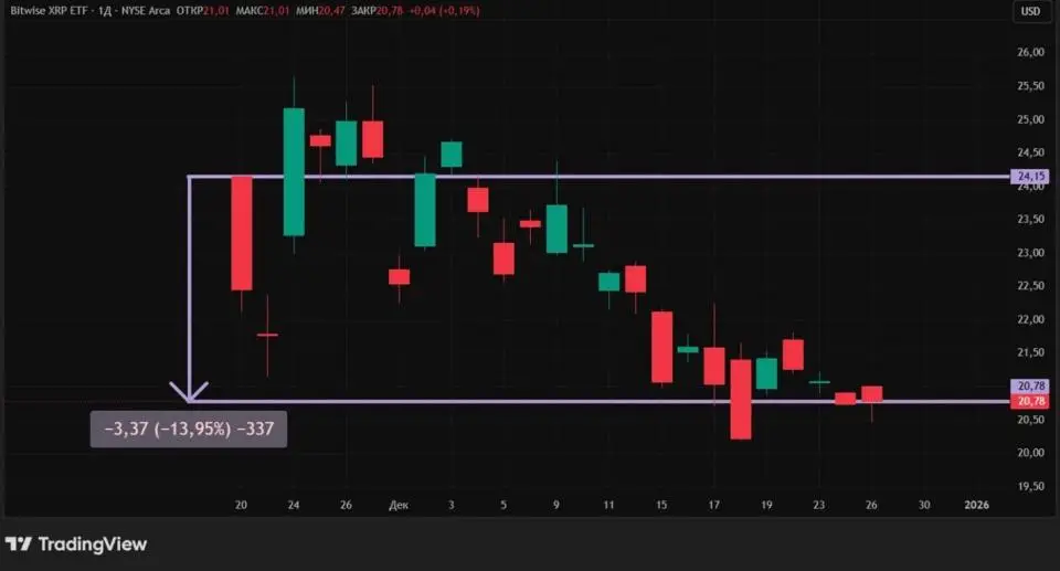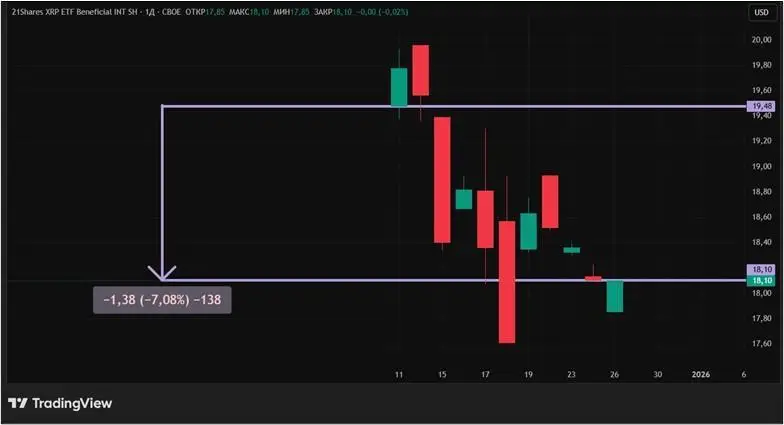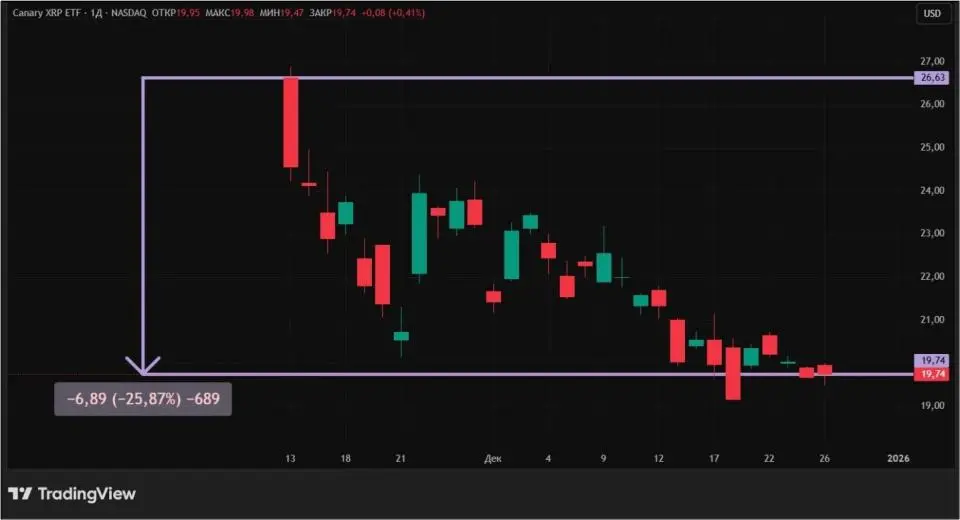 Акции фонда были допущены к торгам 13 ноября 2025 года. Их первоначальная стоимость равнялась $26,63, однако за полтора месяца ценные бумаги XRPC обвалились на 25,87% — до $19,74.