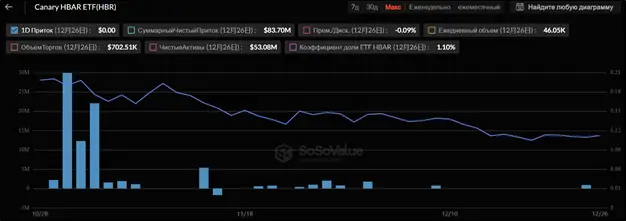 За этот же период кумулятивный приток средств в Canary HBAR ETF составил $83,7. Лишь по итогам одной торговой сессии с октября по декабрь инвесторы вывели деньги из спотового биржевого фонда на HBAR от Canary Capital. Случилось это 14 ноября — отток средств в тот день составил $1,71 млн.