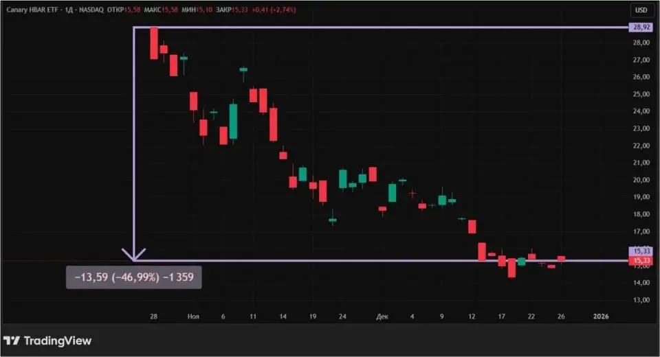 Акции Canary HBAR ETF торгуются на Nasdaq с 27 октября 2025 года. Первоначально они размещались по цене $28,92. На конец декабря 2025 года это все еще исторический максимум HBR. За два месяца торгов ценные бумаги биржевого фонда снизились на 46,99%.