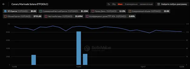 В этот же период Canary Marinade Solana ETF смог зафиксировать достаточно скромный приток средств — $1,33 млн. Дело в том, что большая часть торговых сессий была лишена инвестиционной активности. Денежный поток формировался только 21 ноября, а также 3 и 4 декабря.