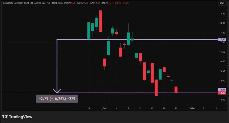 Торговля акциями фонда началась 11 декабря 2025 года. За неполные две недели торгов они снизились на 7,08% — с $19,48 до $18,1.