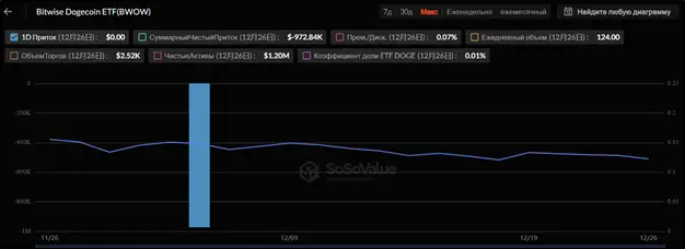 У фонда на счету около 9,9 млн DOGE. Стоимость активов под управлением — $1,2 млн. Администратор BWOW — BNY. В качестве бенчмарка фонд от Bitwise использует CF Dogecoin-Dollar US Settlement Price. Комиссия, взимаемая за управлением этим ETF, составляет 0,34%.