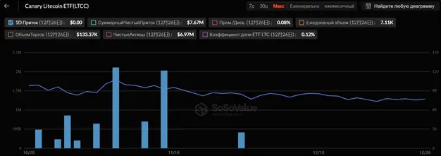 За два месяца фонд смог зафиксировать небольшой приток средств в размере $7,67 млн. Стоит отметить, что в декабре инвесторы проигнорировали LTCC — все торговые сессии в последнем месяце 2025 года отмечены нулевым денежным потоком.