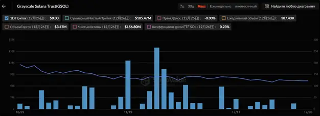 В этот же промежуток времени фонд зафиксировал кумулятивный приток денежных средств на сумму $105,47 млн. Дней, когда инвесторы предпочли бы выводить деньги из Grayscale Solana Trust, в 2025 году не было.