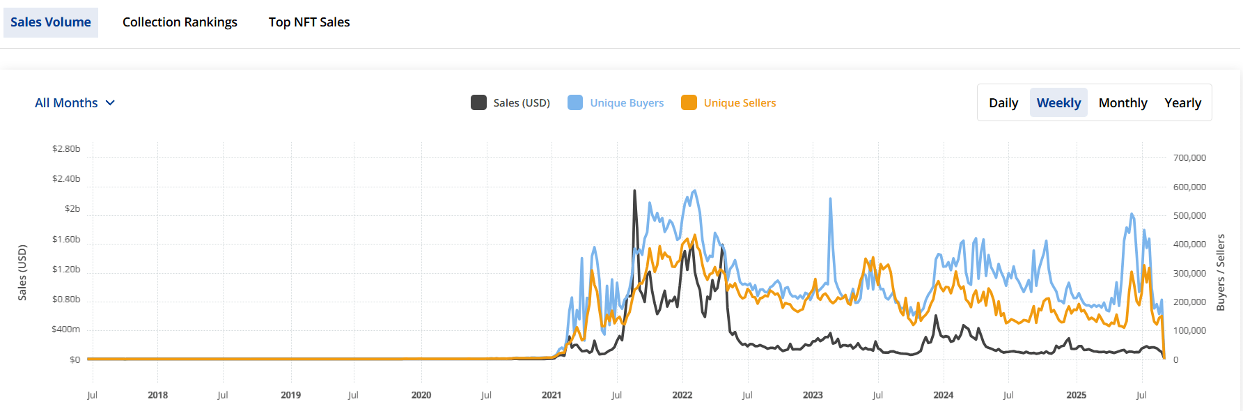 From September 1 to September 7, the number of unique buyers NFT amounted to 199,821 people, which is 58% less than in mid-June. On the other hand, the number of sellers decreased by 43% — only 145,877.