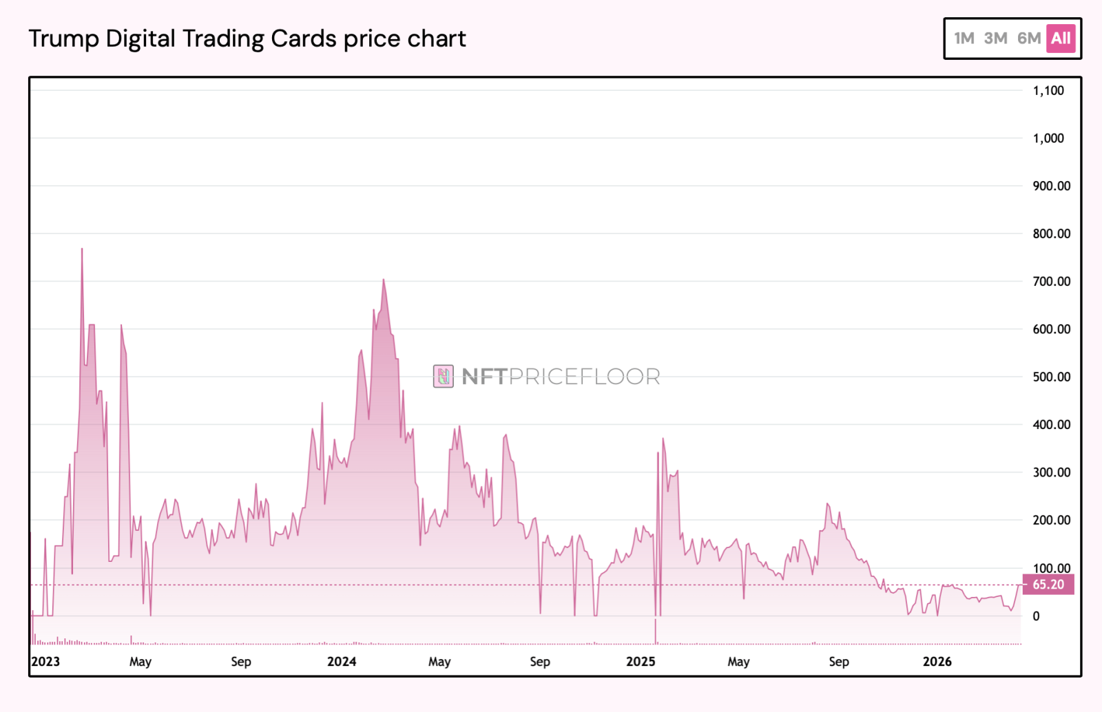 Каждая карточка предлагалась по цене 99 долларов, и по состоянию на этот уик-энд минимальная цена коллекции составляет 64,55 доллара за карточку, что означает падение на 34,8%. Среди сегодняшних предложений $NFT оригинальные коллекционные карточки Trump $NFT занимают 97-е место в топ-100 коллекций, согласно nftpricefloor.com.