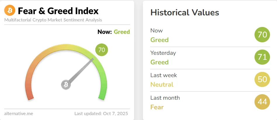 На момент написания индекс страха и жадности находится на отметке 70.