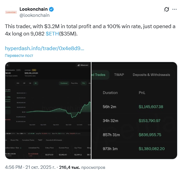 Судя по транзакциям, статистика его сделок отражает впечатляющую серию получения прибыли. Только в октябре трейдер несколько раз получил шестизначный профит, включая $1,14 млн по длинной позиции по ETH и ещё $1,38 млн по длинной позиции по биткоину (BTC).