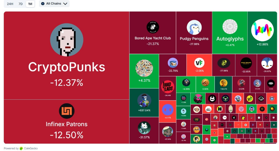 Цены на флагманские коллекции, такие как CryptoPunks, Bored Ape Yacht Club и Pudgy Penguins, за 30 дней упали на 12–28%. Несмотря на это, коллекции, ориентированные на искусство, такие как Autoglyphs, Fidenza Тайлера Хоббса и Chromie Squiggle Сноуфро, показали себя лучше и за тот же период продемонстрировали скромный рост. Так, Sports Rollbots вошла в топ-10 NFT-коллекций по рыночной капитализации при оценке более $58 млн.