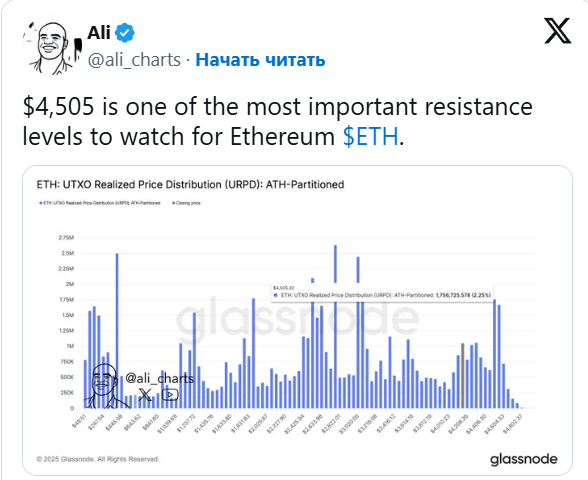According to crypto analyst Ali Martinez, $4505 remains a key level that could determine Ethereum’s short-term direction. He shared a price distribution chart from Glassnode, which shows a high concentration of addresses selling ETH in this range.