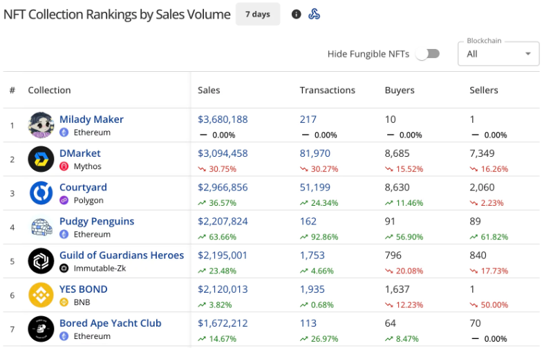 Среди NFT-коллекций лидирует Milady Maker на Ethereum с объёмом продаж $3,68 млн. Коллекция обработала 217 транзакций, в которых участвовали всего 10 покупателей и 1 продавец. DMarket на блокчейне Mythos опустился на второе место с показателем в $3,09 млн, что на 30,75% меньше, чем на прошлой неделе. В коллекции было зарегистрировано 81,970 транзакций с участием 8685 покупателей и 7349 продавцов.
